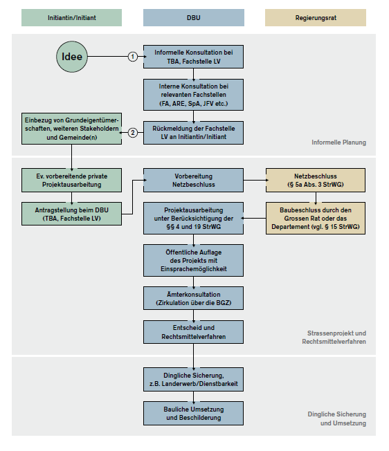 Pour la mise en œuvre du concept VTT thurgovien, il est essentiel de définir les responsabilités en matière d'entretien, de financement et de responsabilité. Dans le canton de Thurgovie, nombre de ces aspects sont abordés dans le StrWG (StrWG).